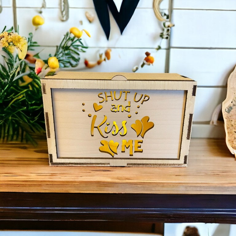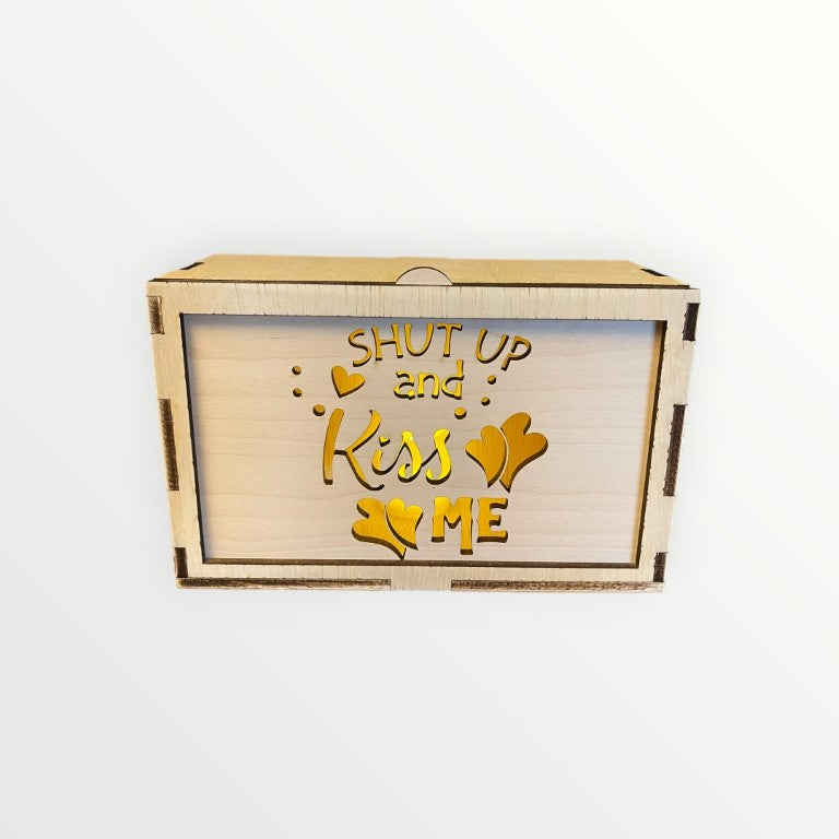 Get cozy with our Shut Up And Kiss Me Horizontal Face! This wooden lantern face is designed to fit on our Rustic Radiance lantern, lit by a LED votive candle. Adorned with a playful "Shut Up and Kiss me" saying, it's the perfect addition to any romantic evening.